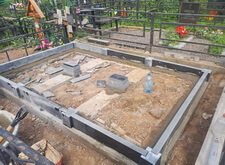 Укрываем внутреннюю зону участка геотекстилем и приносим три массивные прямоугольные плиты, которые в дальнейшем послужат наземным покрытием могилы.